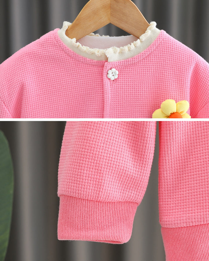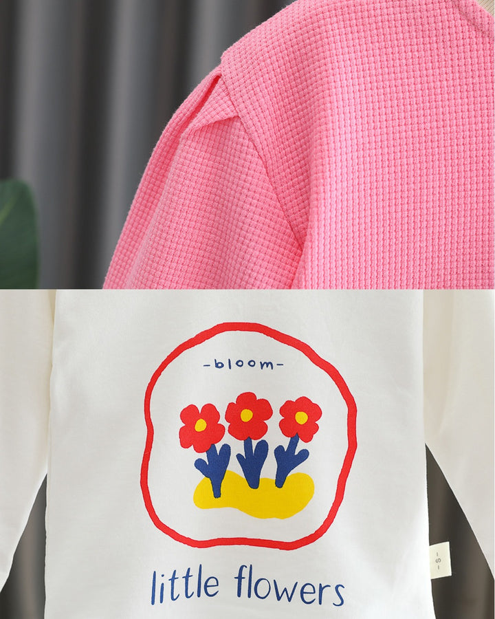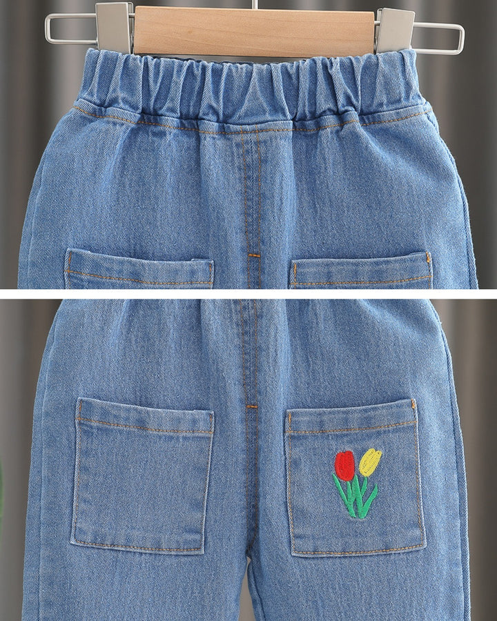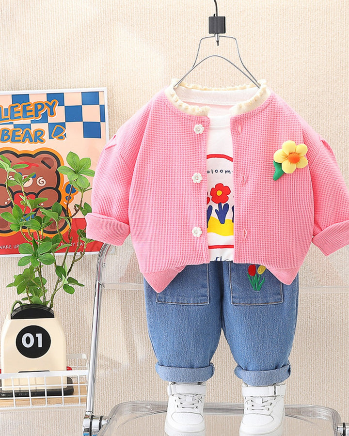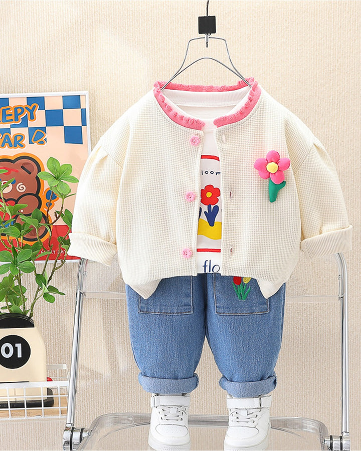 طقم أطفال ناعم – جينز بلونين مع بلوزة بيضاء أو زهرية 🌸👖