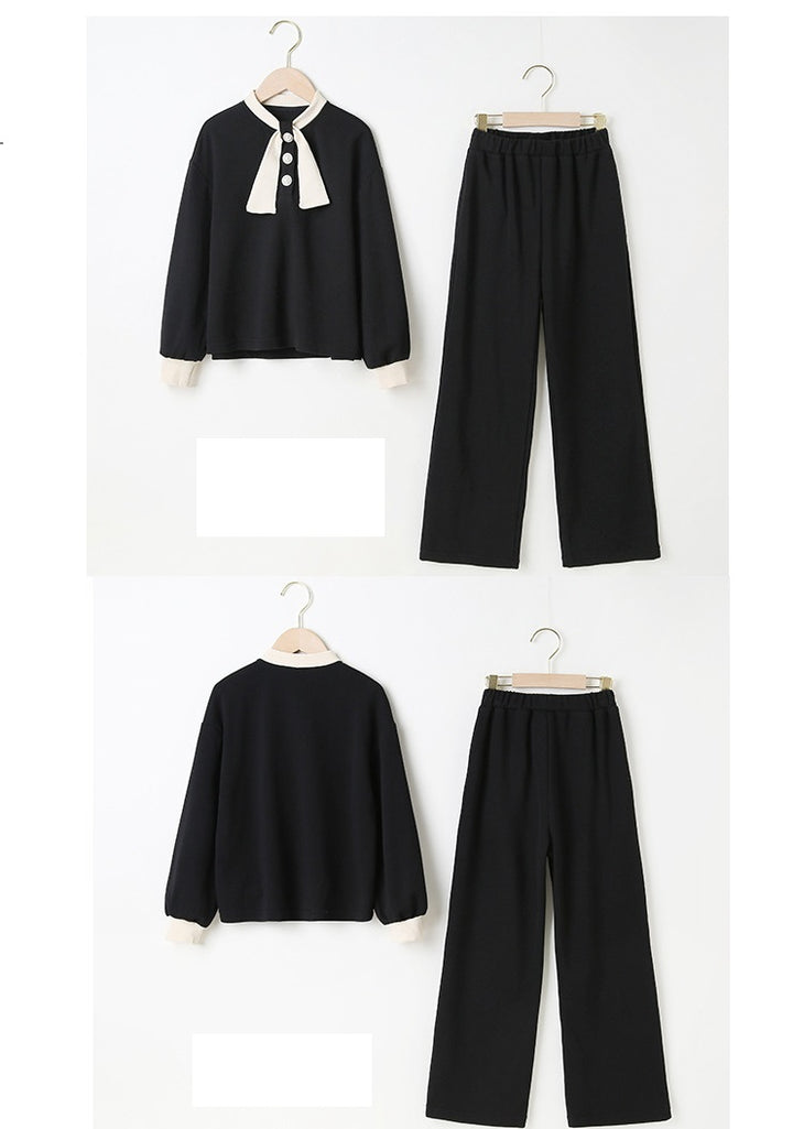 يتكون الطقم من قميص أنيق بتفاصيل فرنسية مثل ياقة مفرغة أو مزينة بالدانتيل، وأكمام منفوشة أو مكشكشة تضفي أنوثة ناعمة، ويُنسّق مع بنطال أو تنورة سوداء كلاسيكية بقصة راقية تمنح الطقم طابعًا رسميًا أنيقًا.