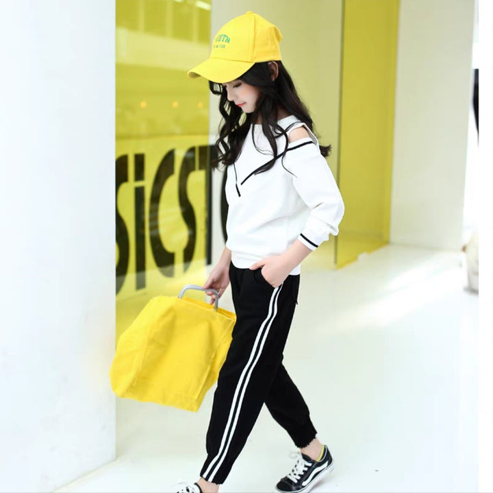 امنحي طفلتك إطلالة عصرية ومليئة بالثقة مع هذا الطقم البناتي الأسود السبور المصمم بأسلوب أنيق ومريح. يتميز بتفصيل مثلث أبيض باتجاه الرقبة يضيف لمسة مميزة وجريئة تجعل التصميم فريدًا ولافتًا.