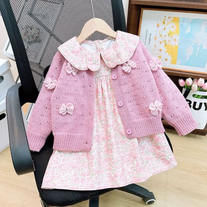 يتكون من فستان زهري أنيق بتصميم ناعم وبسيط، مزين بتفاصيل رقيقة تضيف لمسة من الجمال الطفولي، مع جاكيت صوف دافئ بلون متناسق يمنح الطفلة دفئًا وأناقة في الأيام الباردة.