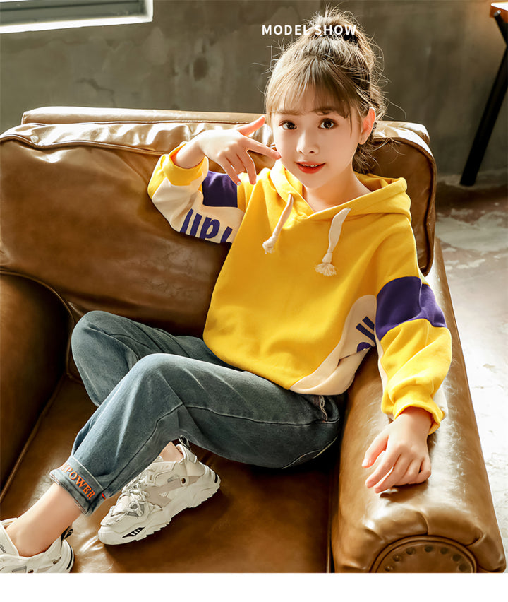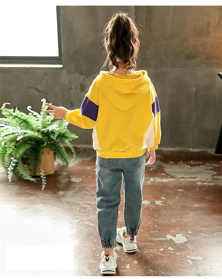 أضيفي لمسة من الأناقة المرحة لخزانة صغيرتك مع هذا الطقم البناتي العصري المكون من بنطلون جينز أنيق وبلوزة صفراء مشرقة.